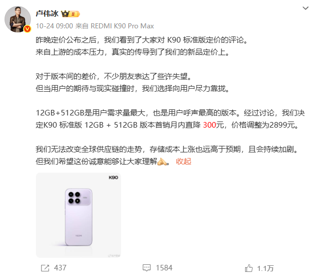 发布会第二天,小米总经理卢伟冰就紧急宣布,12GB+512GB版本首销降价300元,还解释说“上游的成本压力,确实传到了我们新品的定价上”。