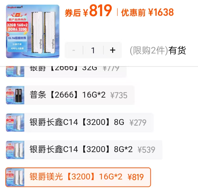 金百达一款热销的DDR43200MHz16G×2内存套条,今年6月还不到300元,到双十一得花800多才能买到。