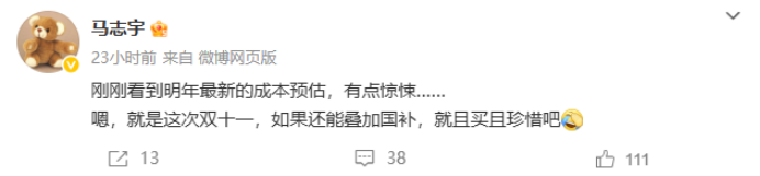 昨天,小米产品行销总监马志宇发了条微博,说“刚刚看到明年最新的成本预估,有点惊悚……”还提醒大家,如果这次双十一还能叠加国补,那就且买且珍惜。